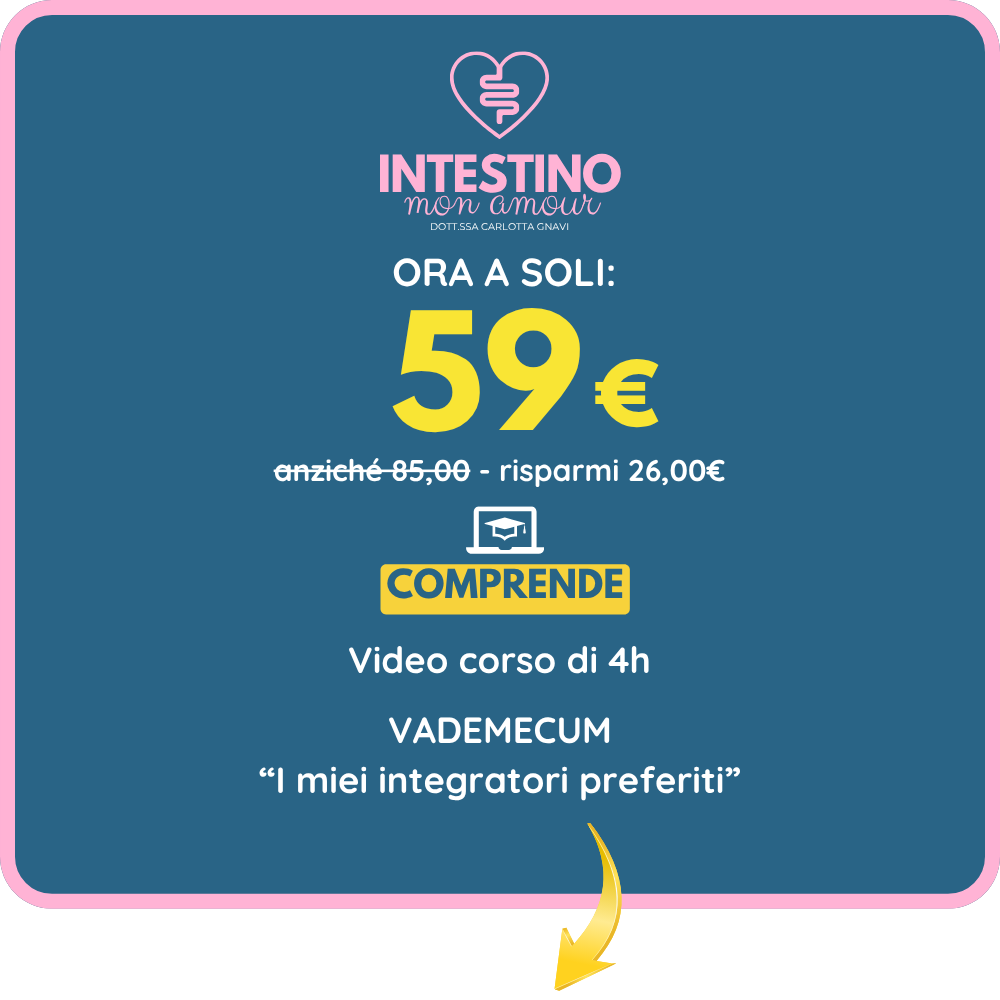 Intestino Mon Amour è un corso che consiglierei a tutti, a chi non riesco ancora a ricevere in consulenza privata per iniziare autonomamente a prendersi cura del proprio intestino e capire cosa fare, a chi ho la fortuna di poter seguire personalmente perché “più conosciamo più siamo liberi“, come ripeto sempre, e non solo attraverso la mia attività didattica si può comprendere meglio ciò che consiglio ma potrete anche diventare voi stessi un aiuto per la vostra famiglia, i vostri amici e tutti coloro che avranno modo di vedere i vostri progressi. Può essere utile a chi è in terapia e seguito da un medico specialista per poter lavorare in modo sinergico, migliorare l’efficacia dei farmaci e favorire la capacità di autoguarigione del corpo così da velocizzare il percorso terapeutico.